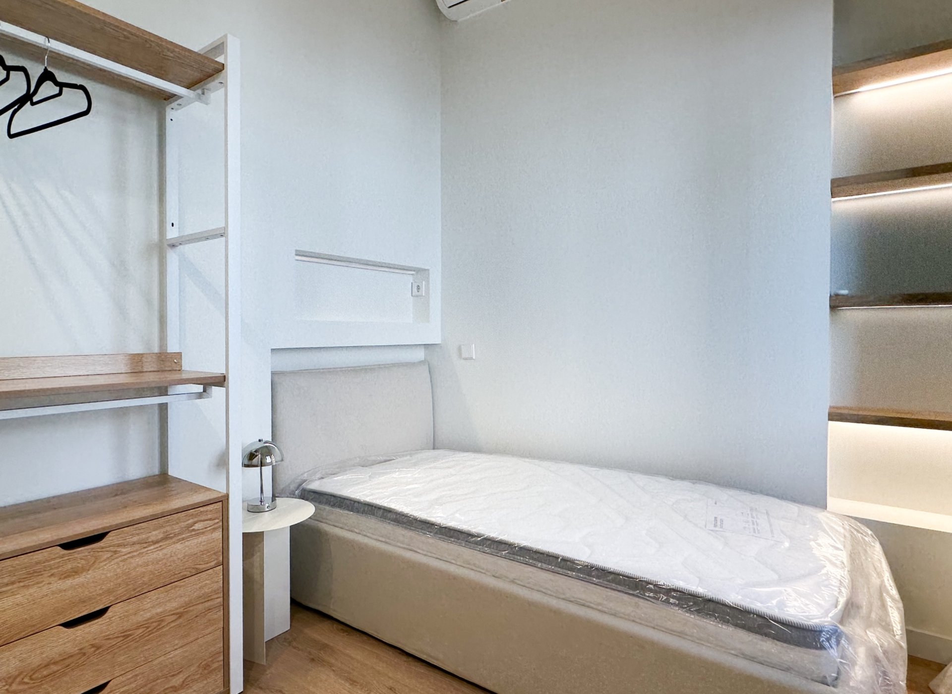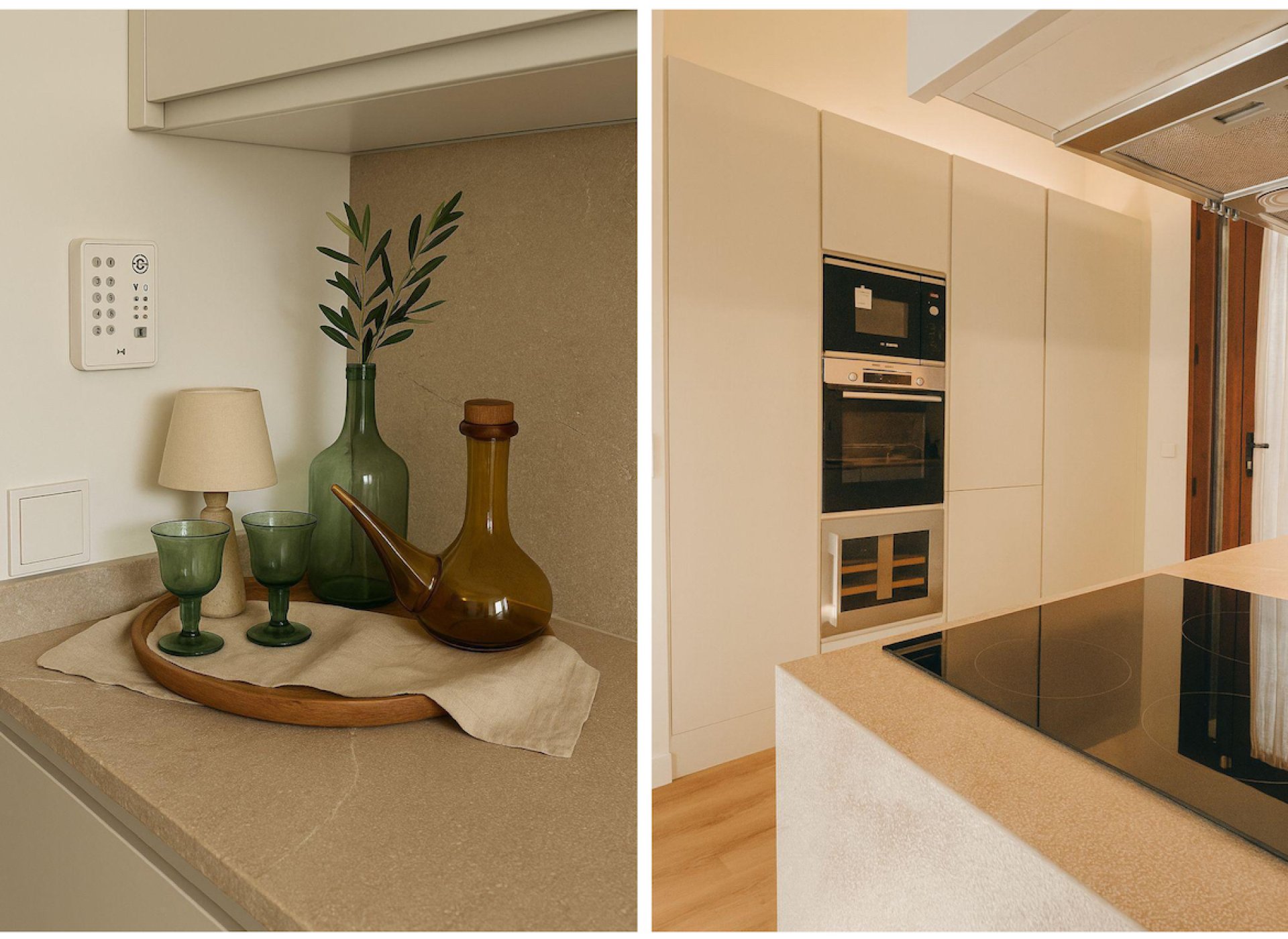 The apartment offers an impressive ceiling height of nearly 4 meters, a custom-designed kitchen equipped with Bosch appliances and a wine cooler, a Mallorcan stone countertop, and bespoke floor-to-ceiling wardrobes.