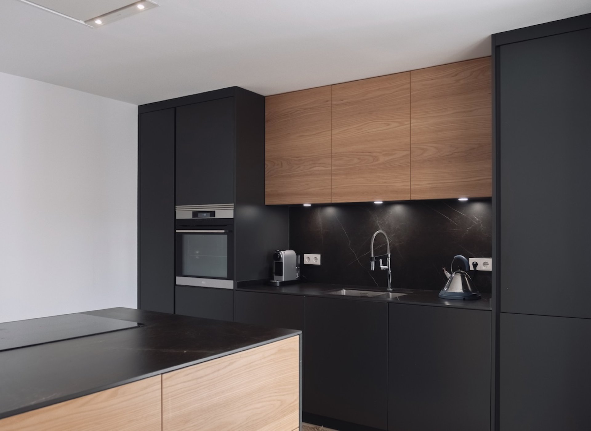 On the lower level, a single bedroom and a second bathroom with a shower. The open-plan living area, where a sleek modern kitchen and living room flow seamlessly onto another terrace. From here, a staircase leads down to the stunning 68 m² private patio with a sunbathing area and swimming pool, creating the perfect setting for relaxing or entertaining.