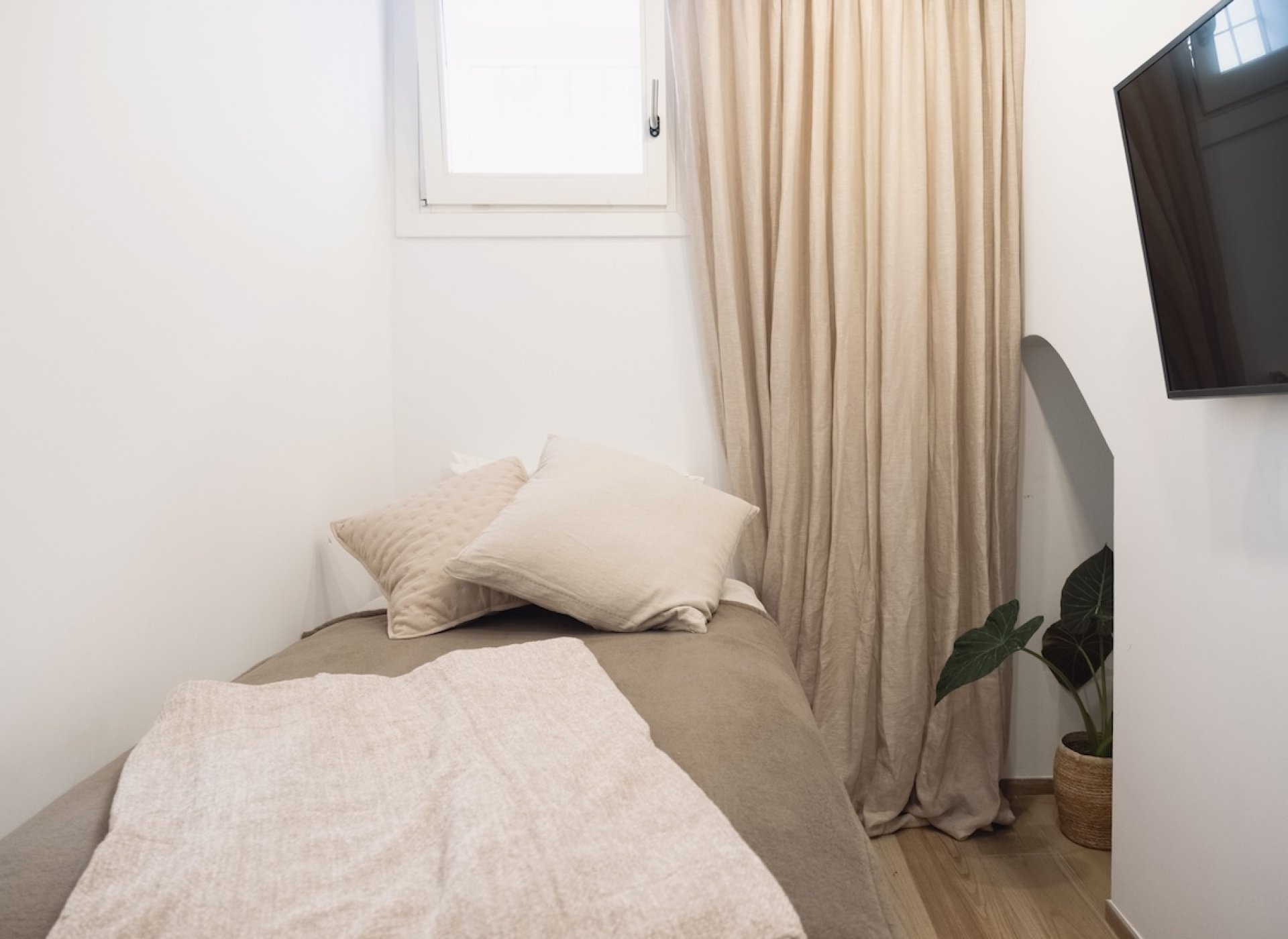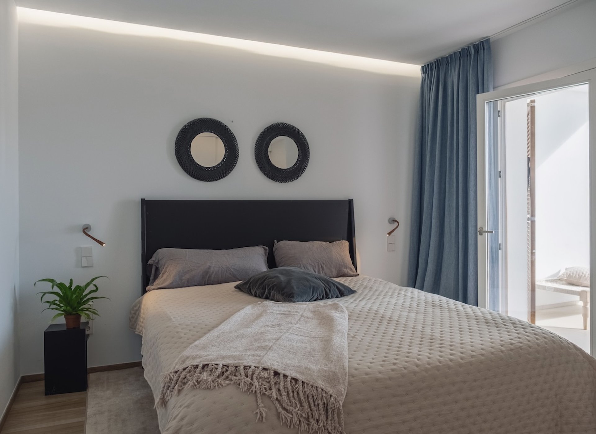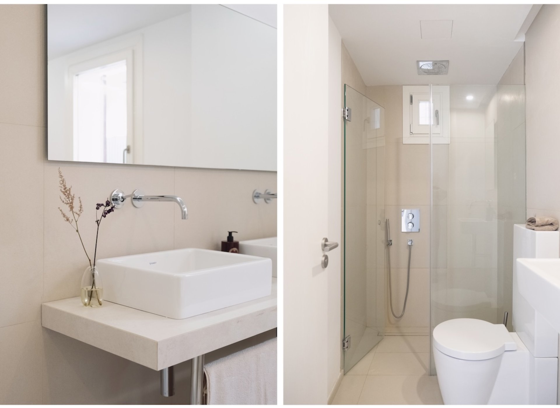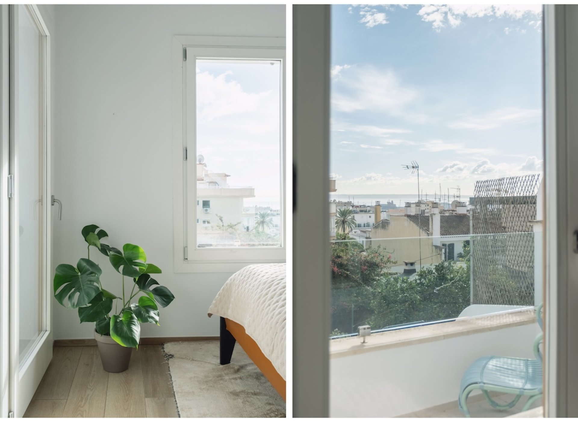 The upper floor offers two bedrooms — two generous doubles with direct access to a private terrace with beautiful sea views. You will also find a full bathroom on this level with a big shower and a bath.