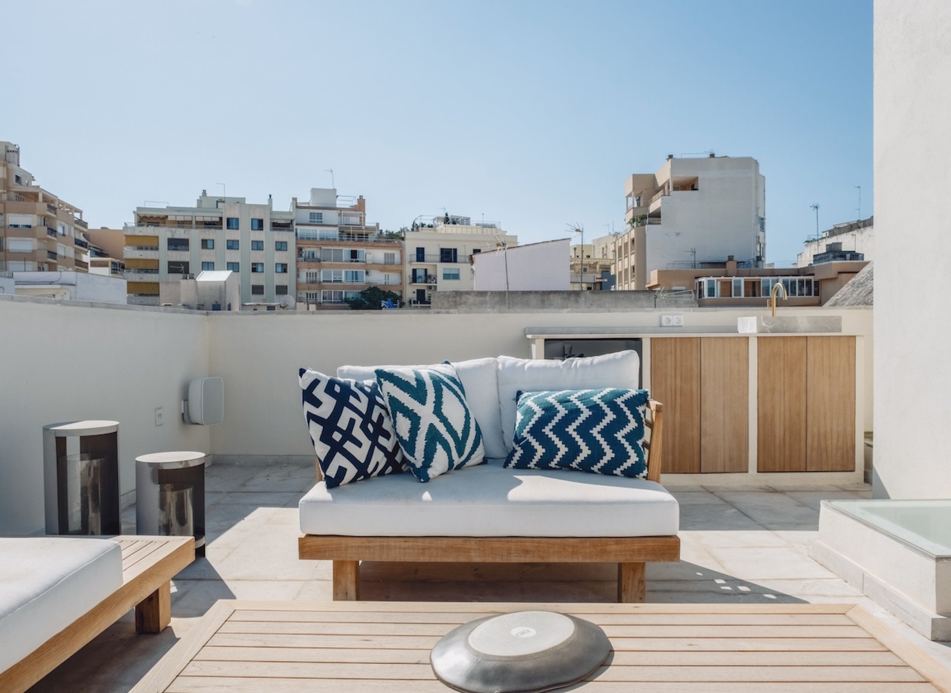 The first floor comprises three bedrooms and two bathrooms, with two of the bedrooms having balconies overlooking the pool area. The master bedroom is en-suite and has direct access to the large rooftop terrace, which has a cosy sitting area and an elegant outdoor kitchen with a mini fridge, perfect for enjoying a quiet evening. There is an additional guest bathroom with a laundry room on the ground floor.