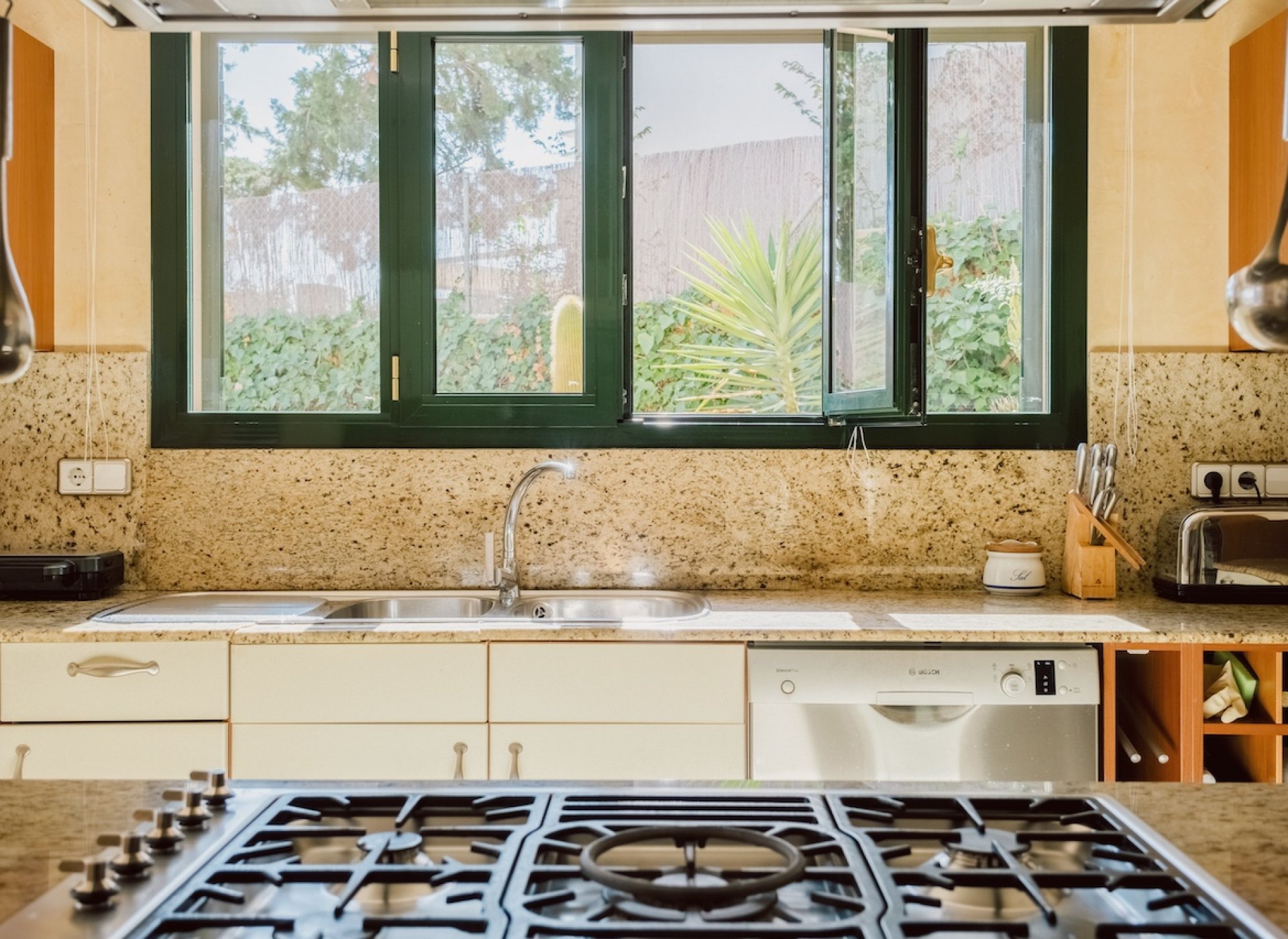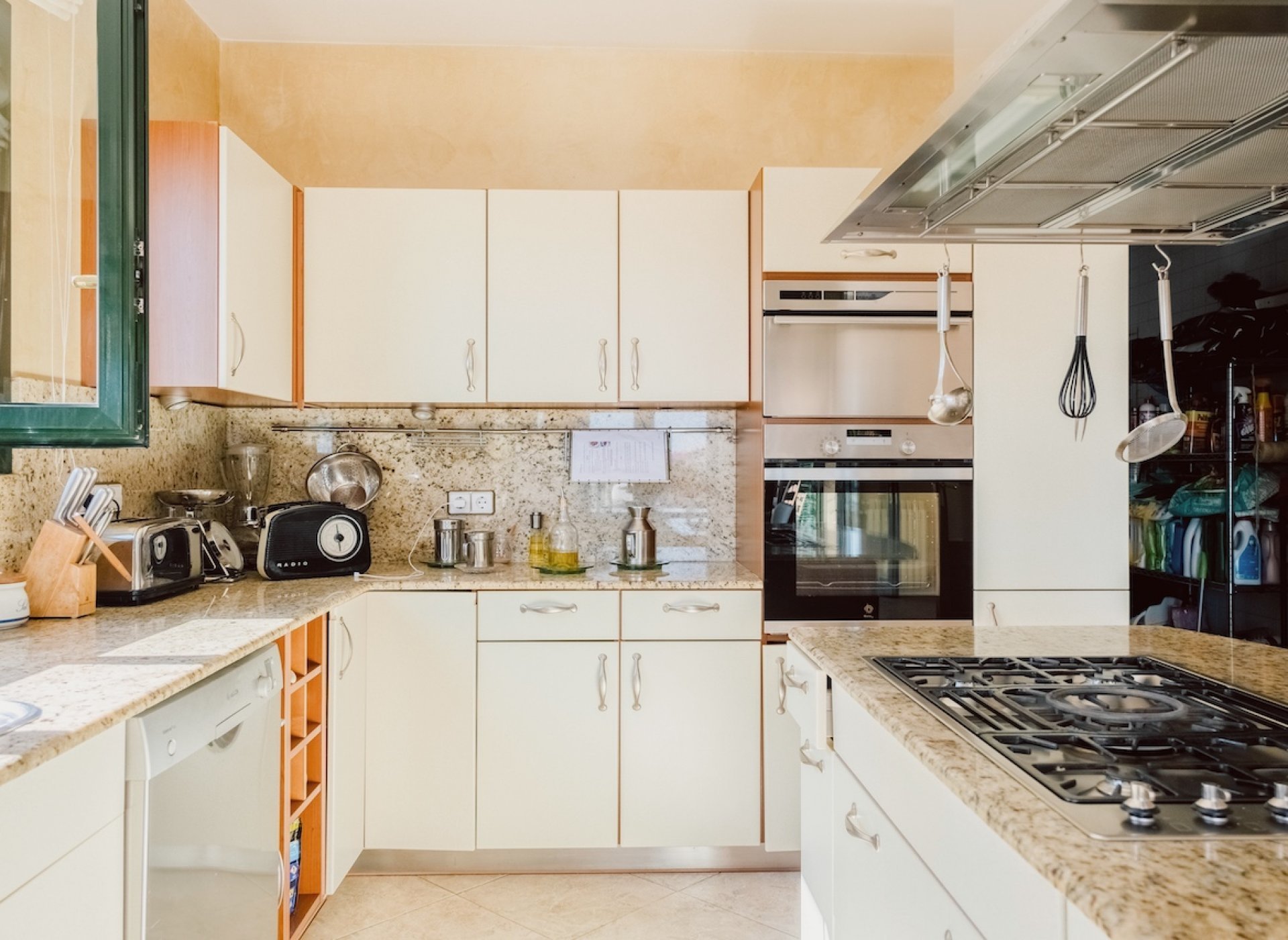 The house is divided into three floors: On the first floor, the entrance level, we find a very bright living room and kitchen with dining space, with direct access to a large covered terrace, the pool, and the garden. This floor also has a guest toilet.