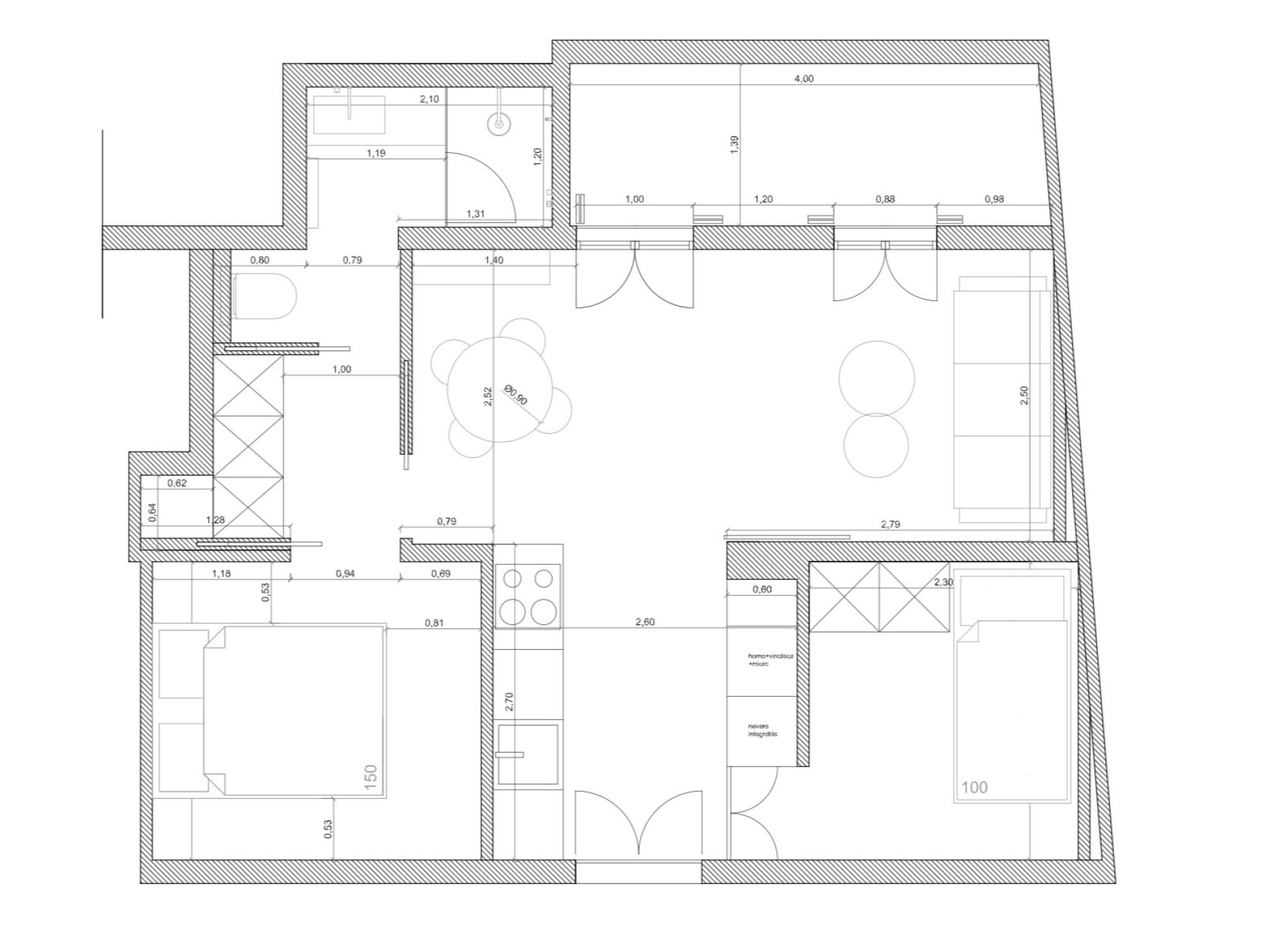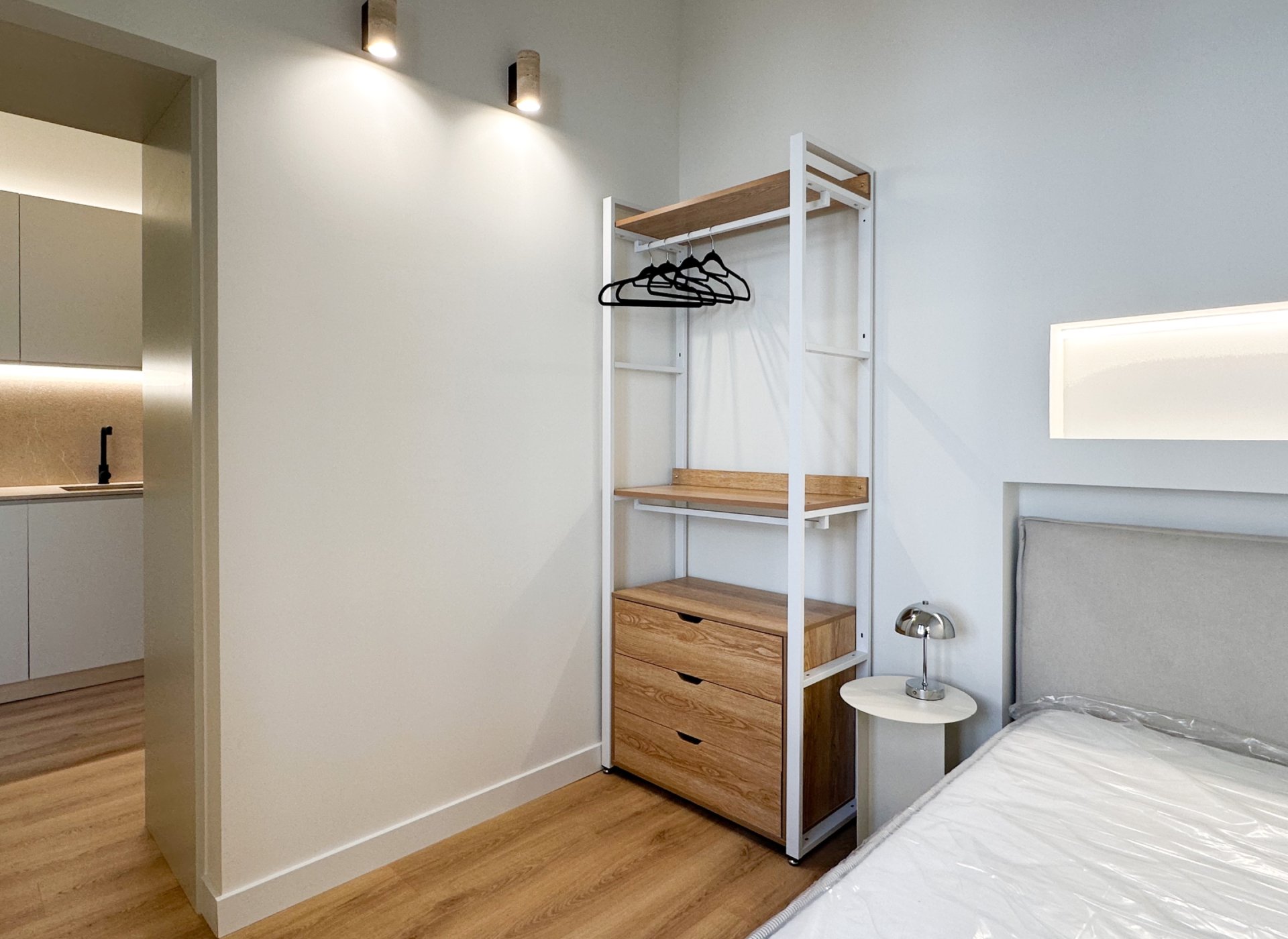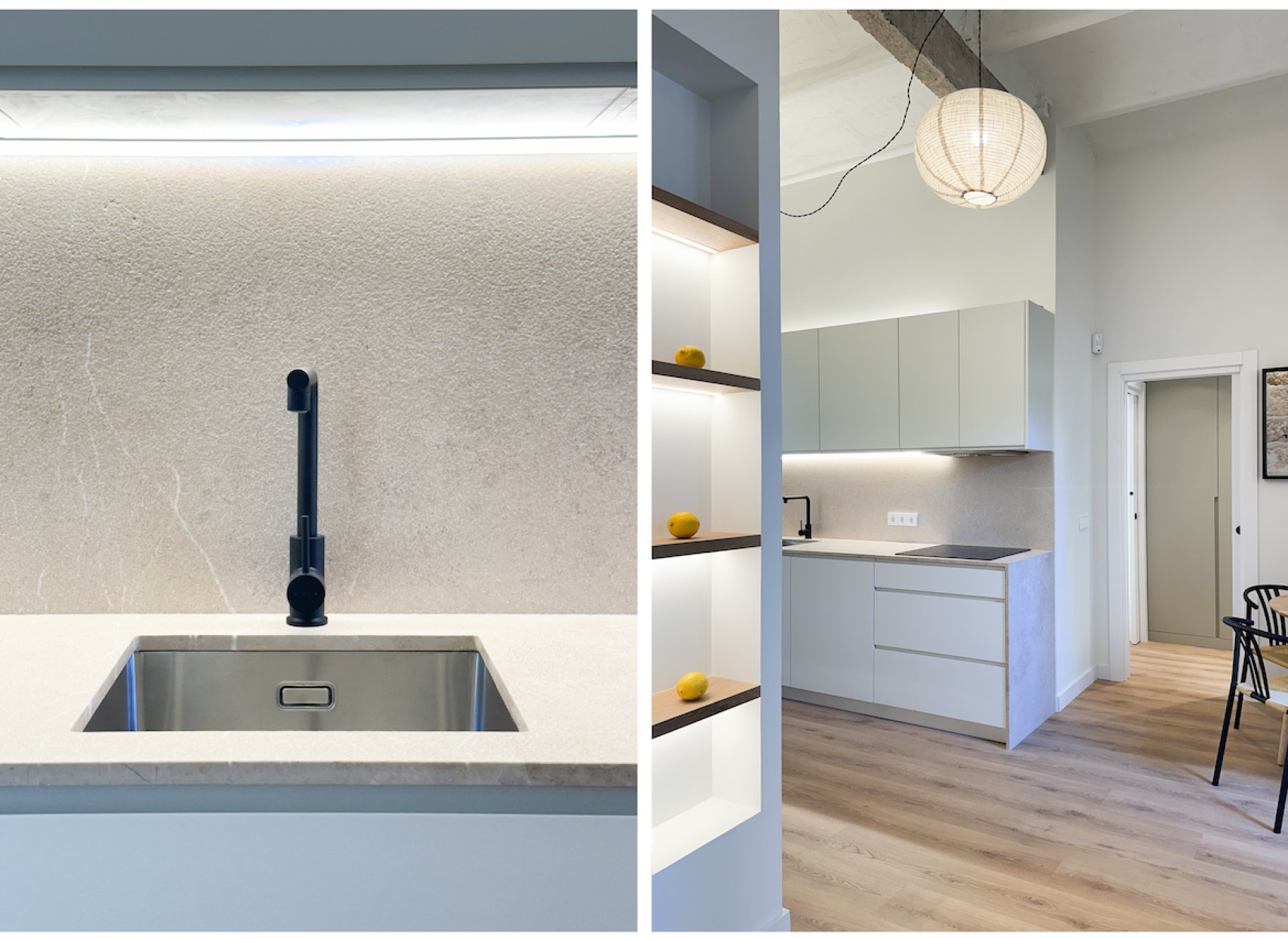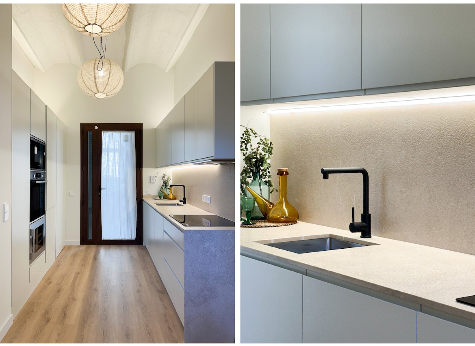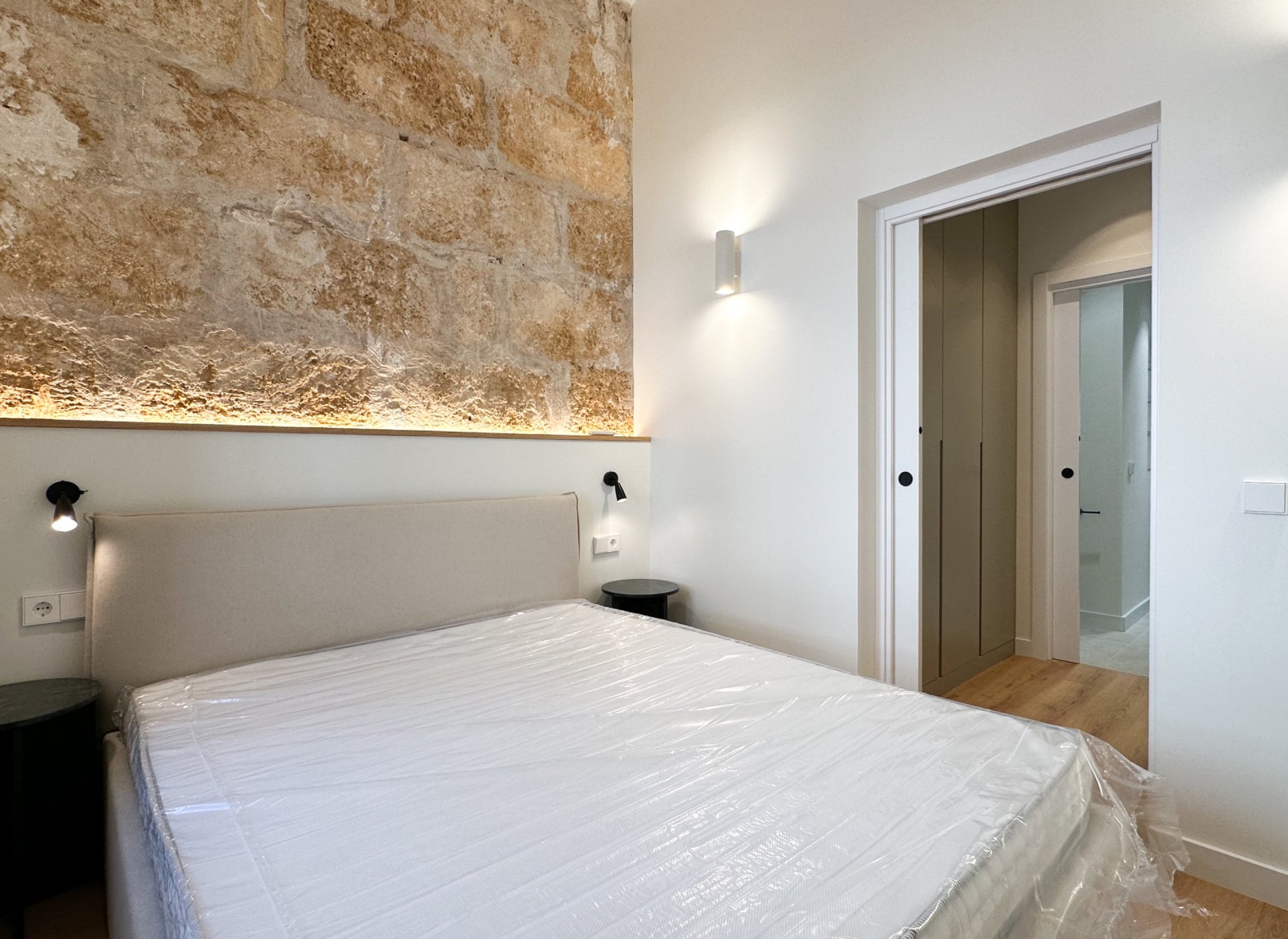 The apartment offers an impressive ceiling height of nearly 4 meters, a custom-designed kitchen equipped with Bosch appliances and a wine cooler, a Mallorcan stone countertop, and bespoke floor-to-ceiling wardrobes.