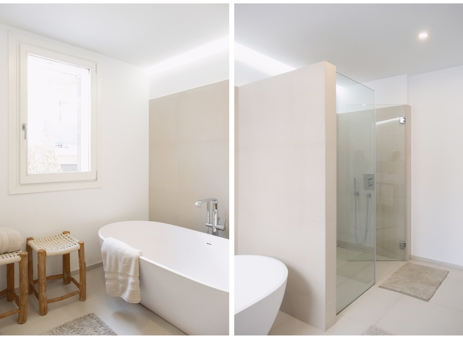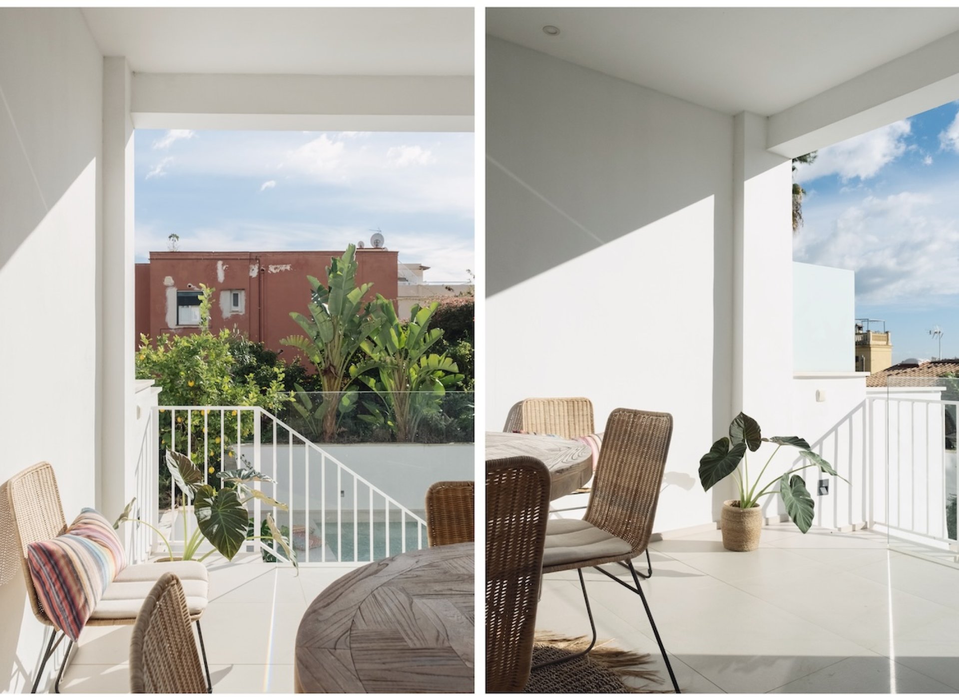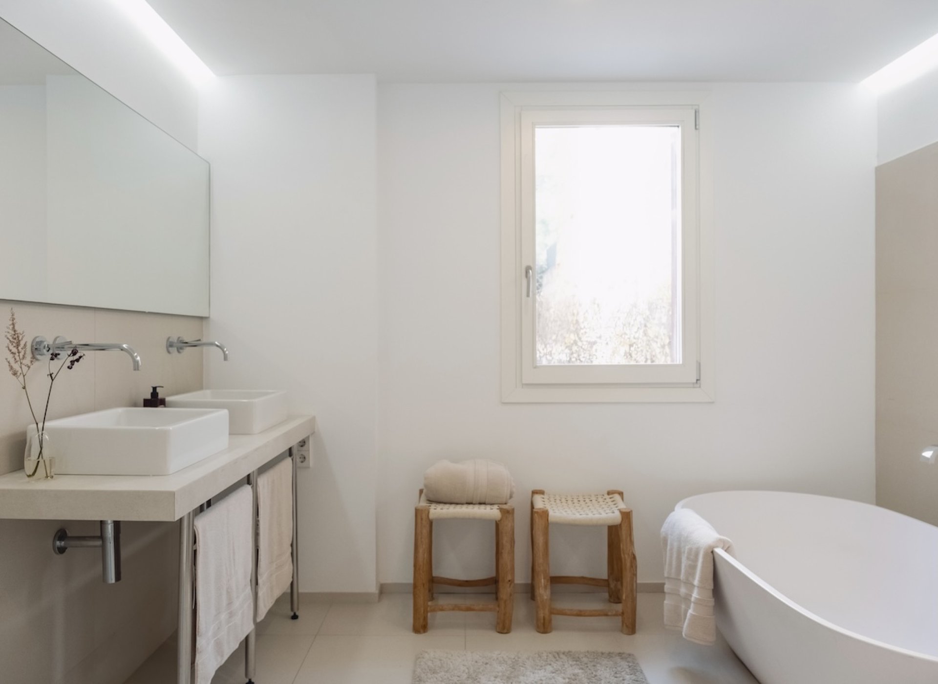 The upper floor offers two bedrooms — two generous doubles with direct access to a private terrace with beautiful sea views. You will also find a full bathroom on this level with a big shower and a bath.