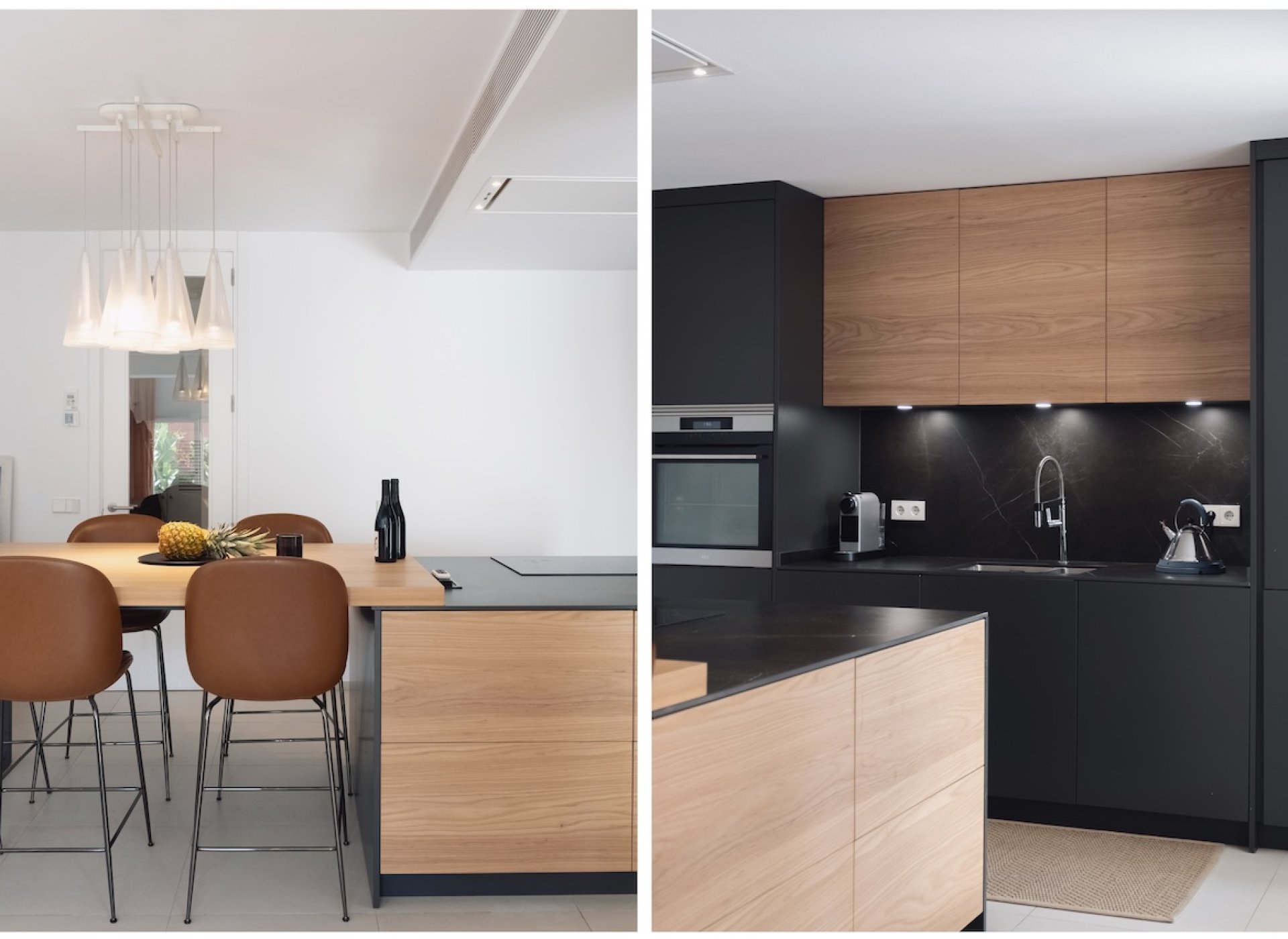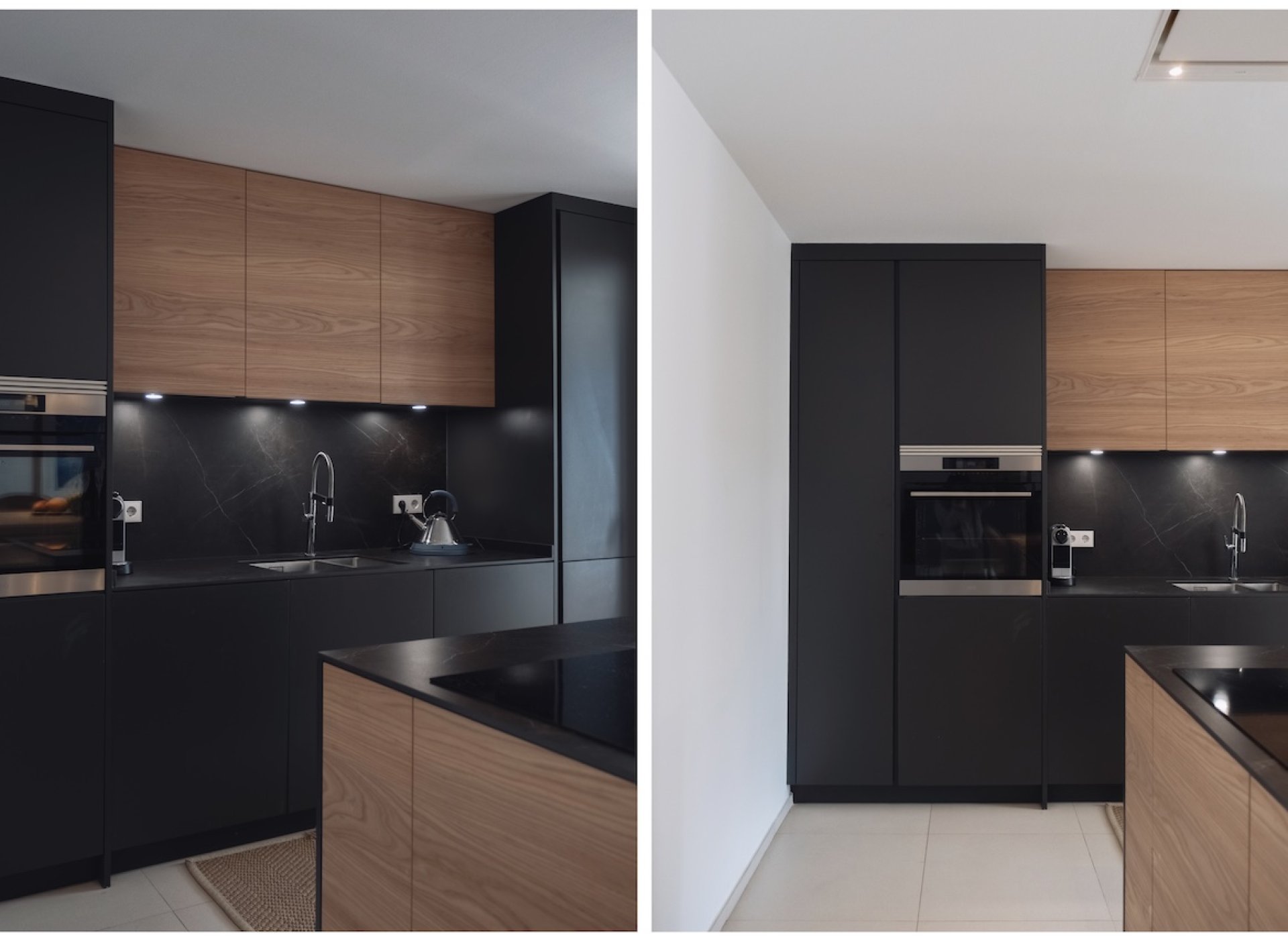 On the lower level, a single bedroom and a second bathroom with a shower. The open-plan living area, where a sleek modern kitchen and living room flow seamlessly onto another terrace. From here, a staircase leads down to the stunning 68 m² private patio with a sunbathing area and swimming pool, creating the perfect setting for relaxing or entertaining.