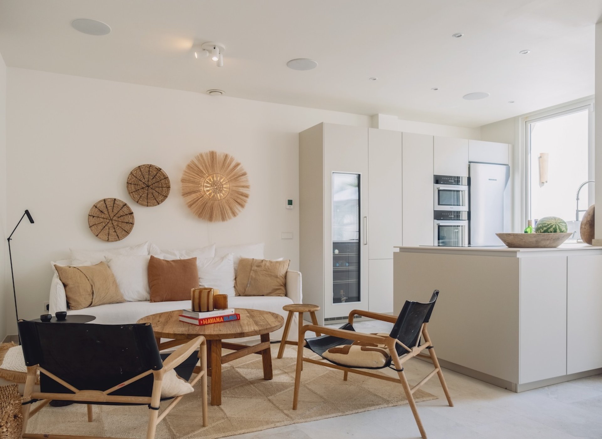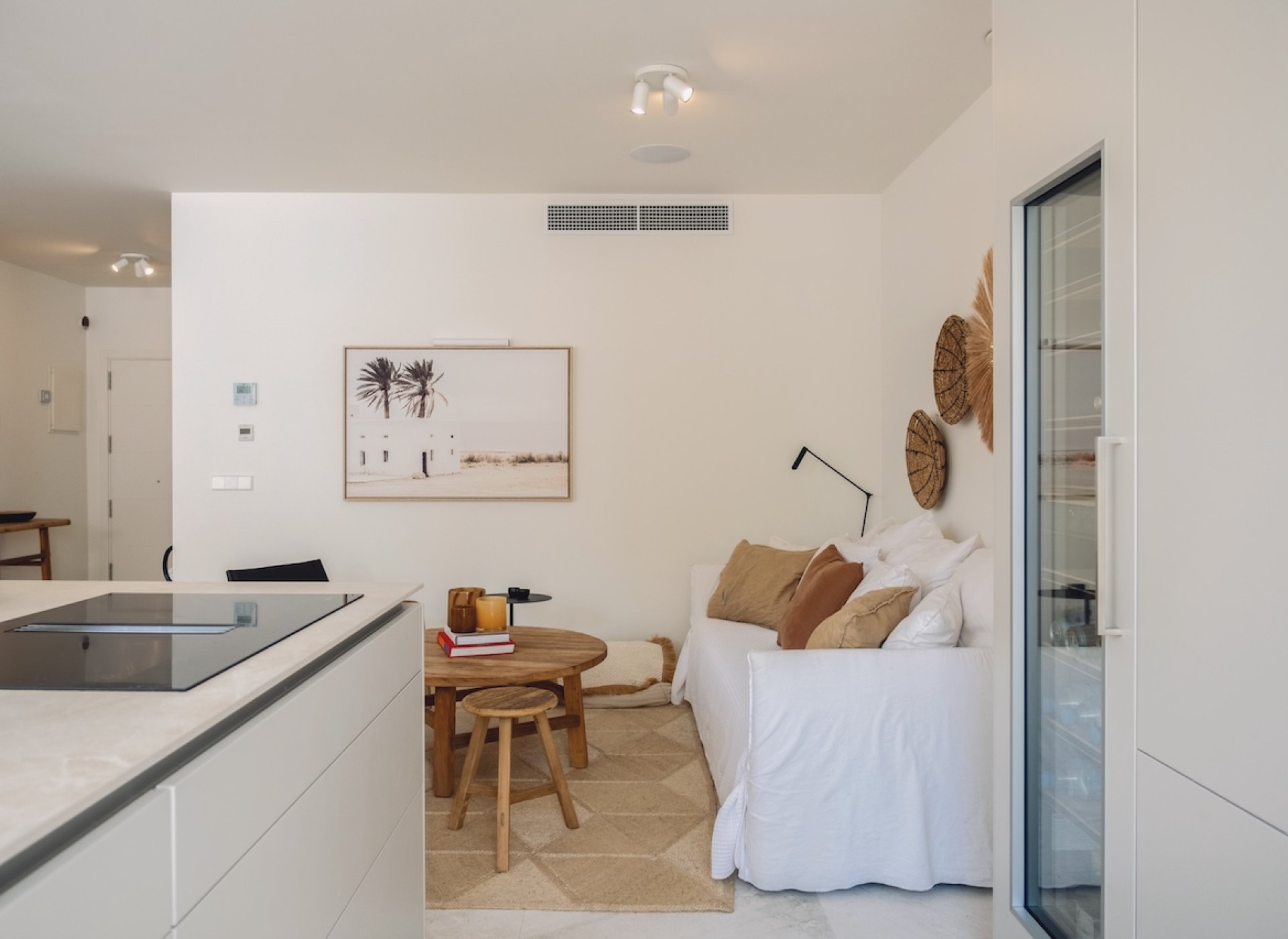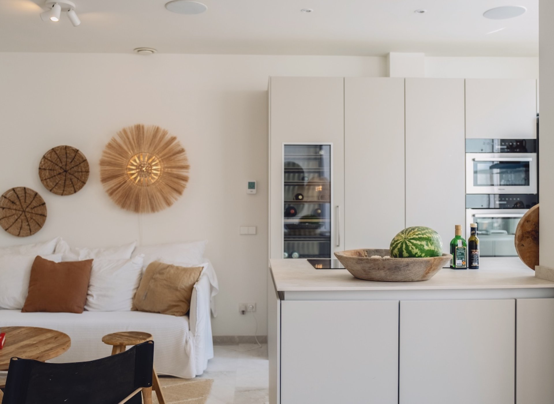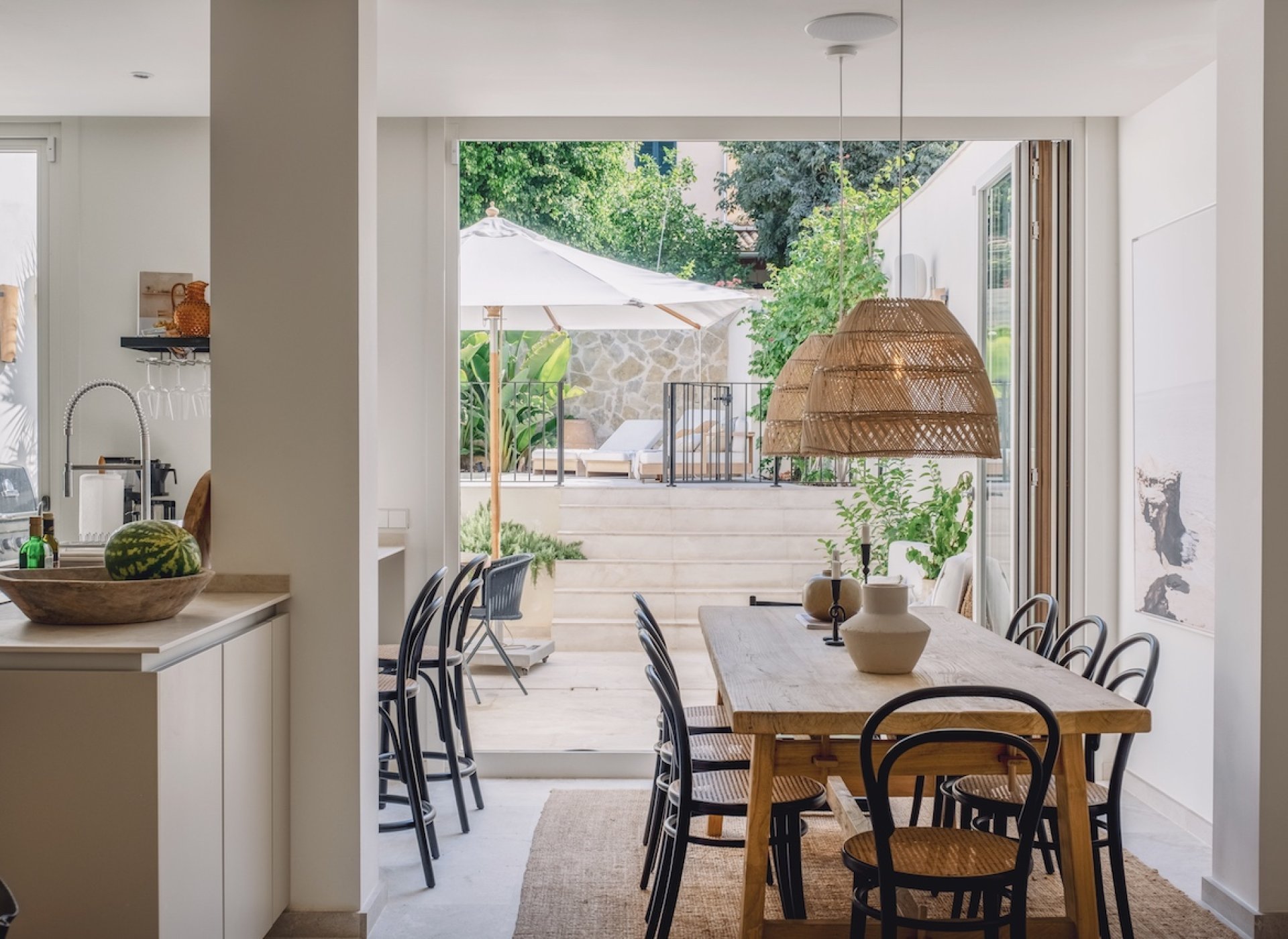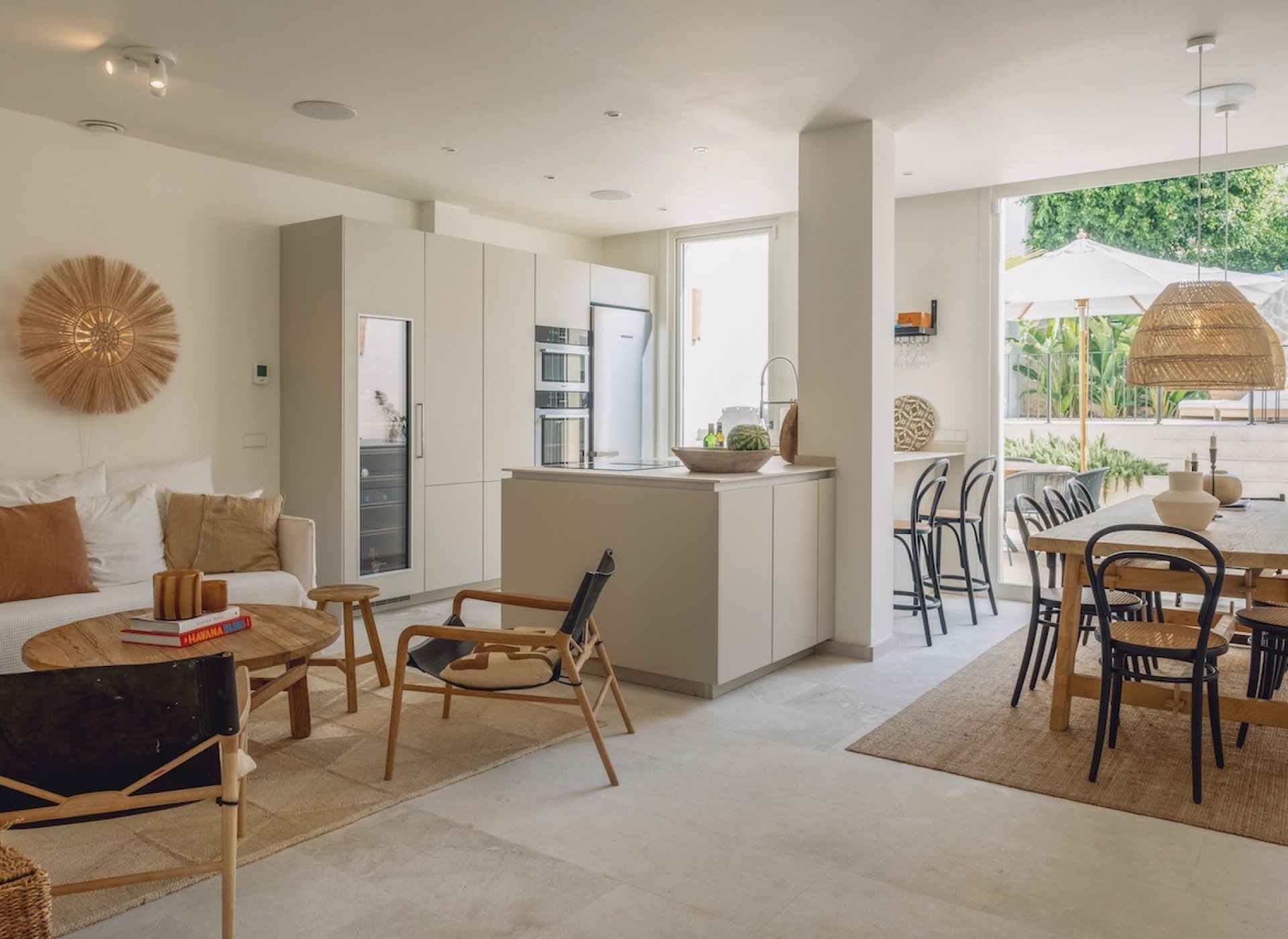 Upon entering, you're welcomed by the lovely flow of modern open living: the kitchen, dining, and living room feature elegant designs and are all open-plan. The big sliding glass doors lead to the terrace with a BBQ and a dining area, perfect for socialising. The pool area, with an outdoor shower and cosy sunbathing space, invites you to enjoy the island's warm weather. The terrace is surrounded by plants, designed to create a private, natural feel.
